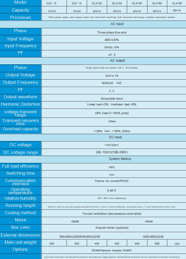 This series of power UPS systems employs CPU control, utilizes high-frequency carrier technology and IGBT power devices, and features double conversion, online operation, and zero-conversion characteristics. When the mains power is normal, single-phase 220VAC (or three-phase 380VAC) is isolated, rectified, and filtered to become DC. This DC is then converted to AC by an inverter before being supplied to the load. If the AC mains input is abnormal or experiences a power outage, the backup 110VDC or 220VDC DC power supply is used for inverter power supply via reverse-blocking diodes. When the DC power supply is undervoltage or experiences a power outage, the static switch switches to bypass power supply; when the mains power returns to normal, it automatically switches back to mains inverter power supply. If the inverter is overloaded or malfunctions, it switches to bypass power supply and simultaneously issues a warning signal.