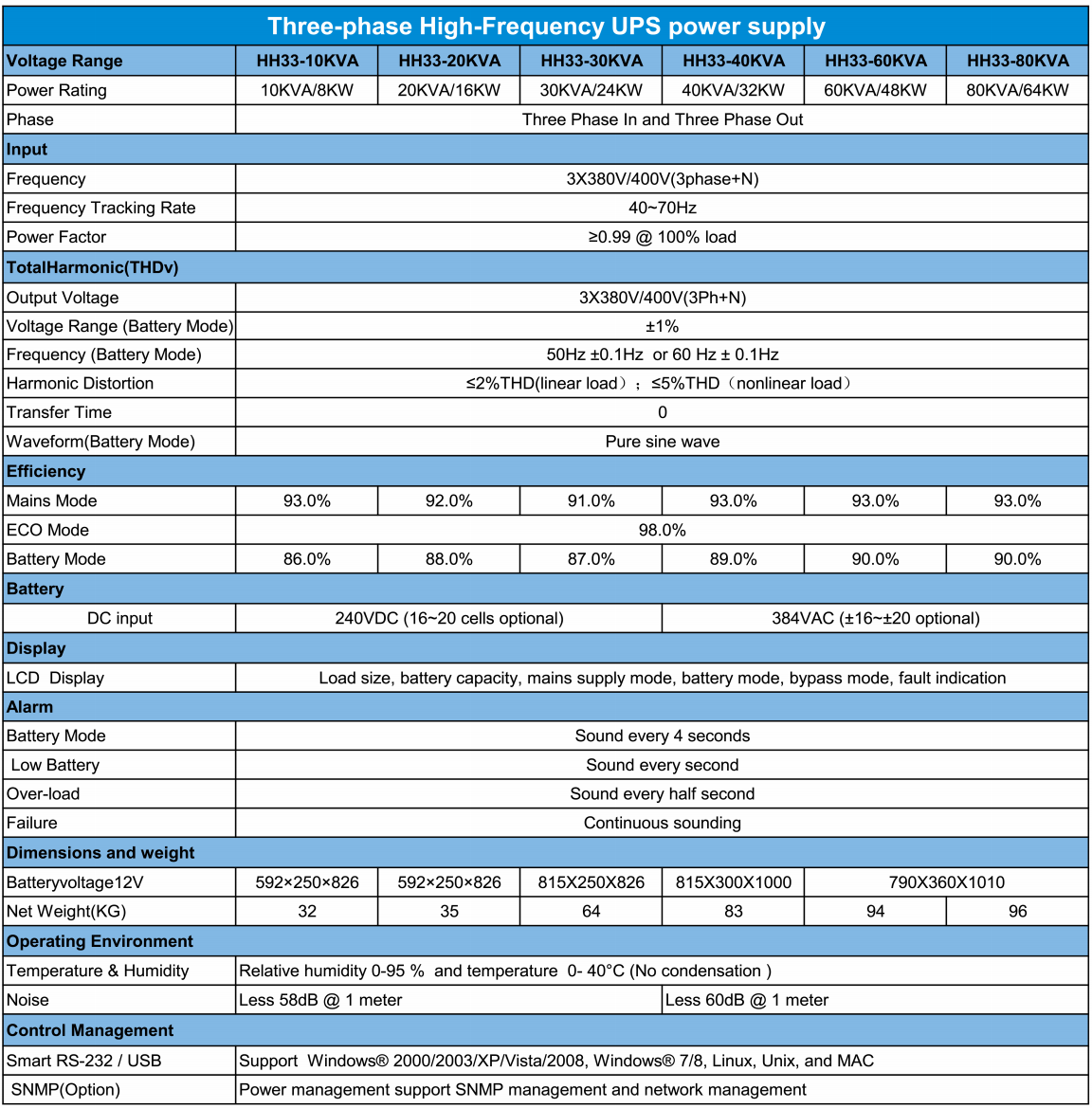 HH-33 series 10kVA to 30kVA (L) has high overall efficiency, 94% double conversion mode efficiency, 98% energy saving mode efficiency, which improves the efficiency of power conversion, reduces operating costs, cover a small area, and saves space; supports parallel sharing the batteries. It saves the initial investment cost and floor space.