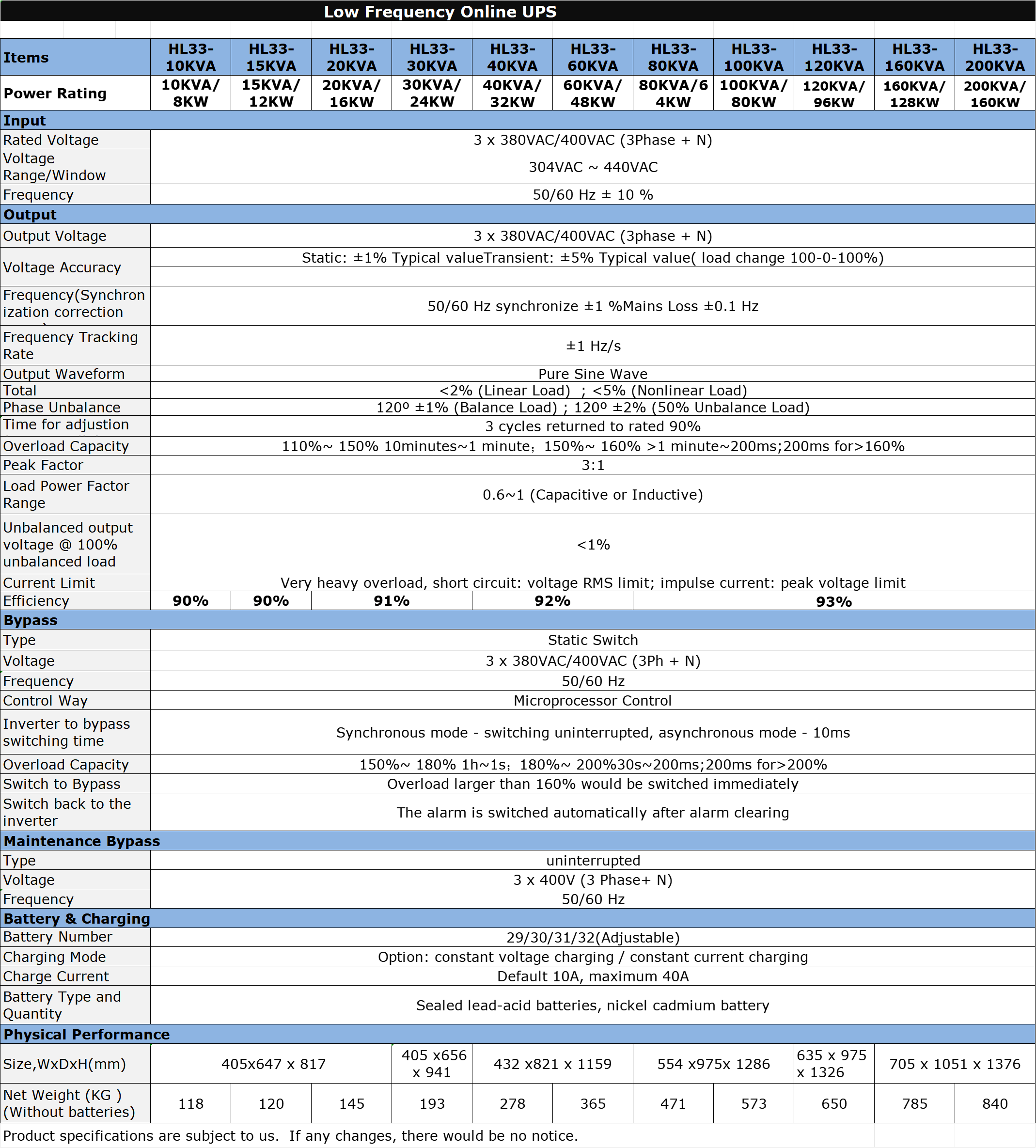 The low frequency HL-33 series UPS is a highly reliable system designed for large-scale critical application systems, such as data processing centers, host systems, manufacturing and telecommunications equipment, and medical equipment. Its high safety and reliability provide important power protection for large critical application systems.